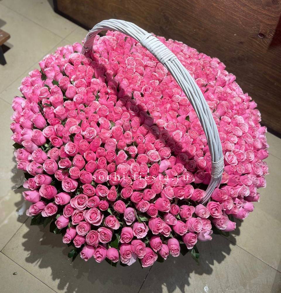 Пятьсот один бутон в корзине — это объем, который заполняет собой все вокруг. Розовый цвет разворачивается волнами, создавая почти скульптурное присутствие в интерьере.