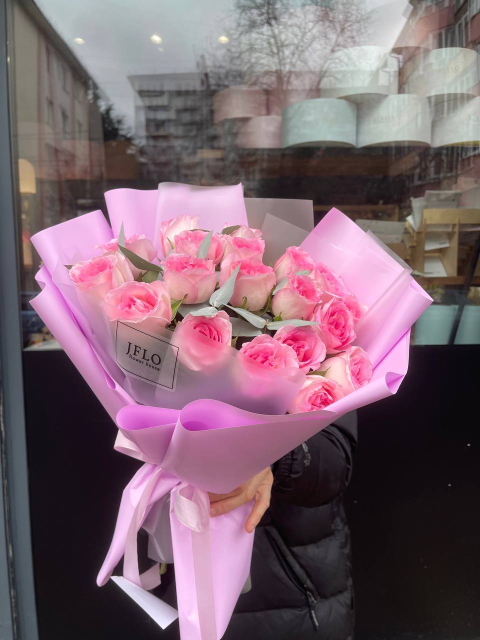 Пятнадцать французских роз Pink Dream с характерно вывернутыми лепестками. Фактура бутонов открывает глубину цвета и добавляет объем всей композиции.
