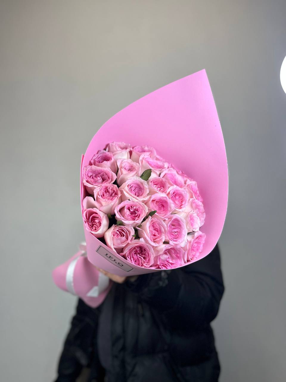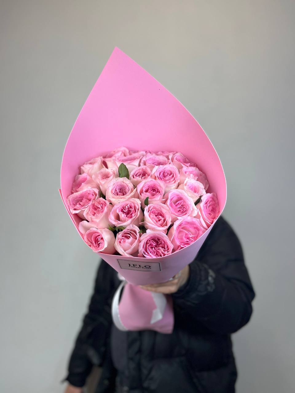 Двадцать одна роза в оригинальной упаковке с игривыми ушками создает настроение легкости и свежести. Розовые бутоны собраны в аккуратную композицию, которая удерживает форму и выглядит выразительно в любом интерьере.