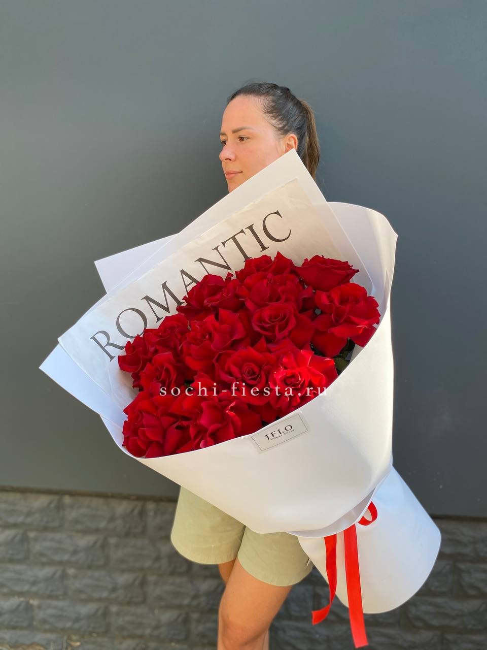 Девятнадцать красных роз с ажурной фактурой лепестков раскрываются постепенно, обнажая глубину каждого бутона. Фоамиран добавляет мягкости силуэту и завершает форму.