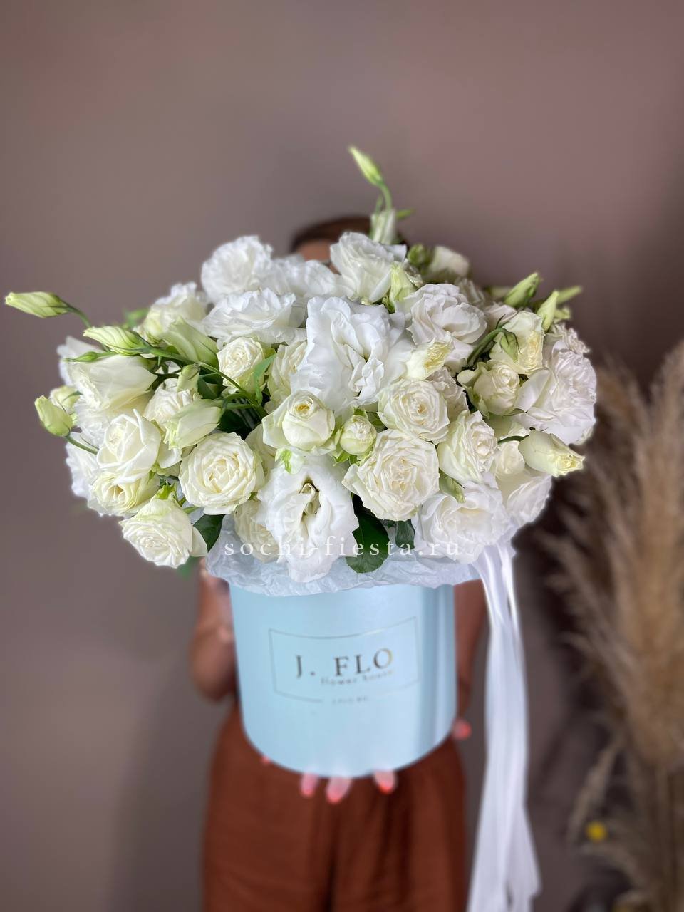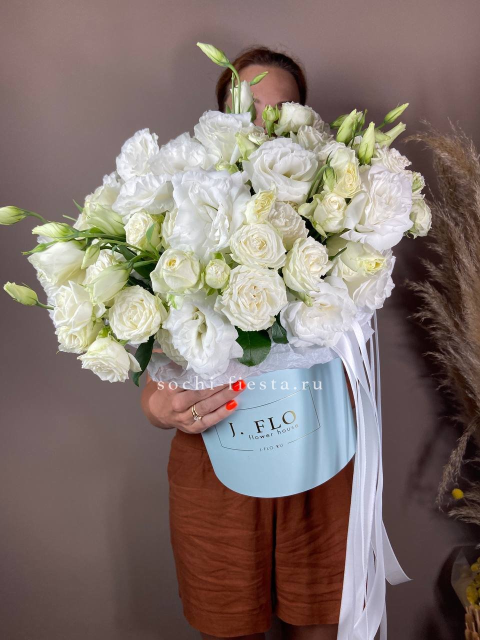 Двадцать пять пионовидных кустовых роз с коробочками хлопка в дизайнерской упаковке. Природная белизна и пышные головки создают объём с мягкими переходами.