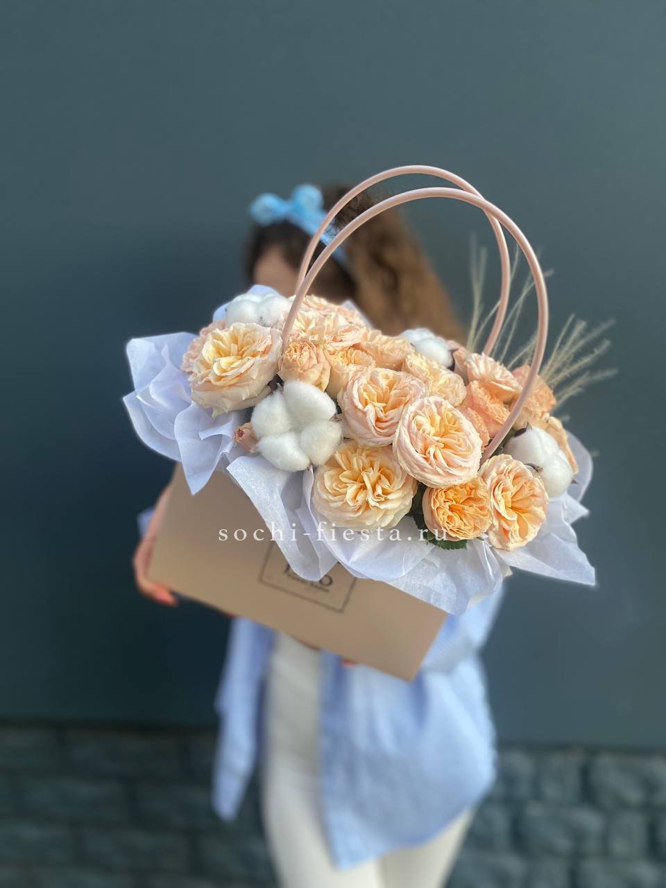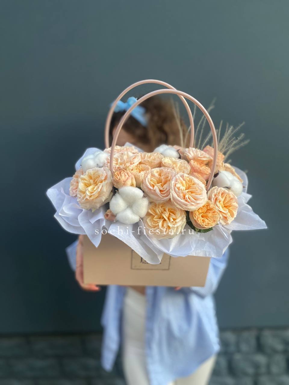 Кустовые розы сорта Джентл с пушистыми коробочками хлопка создают спокойную гармонию в компактной сумочке. Простая композиция для тех, кто любит естественность без лишних деталей.