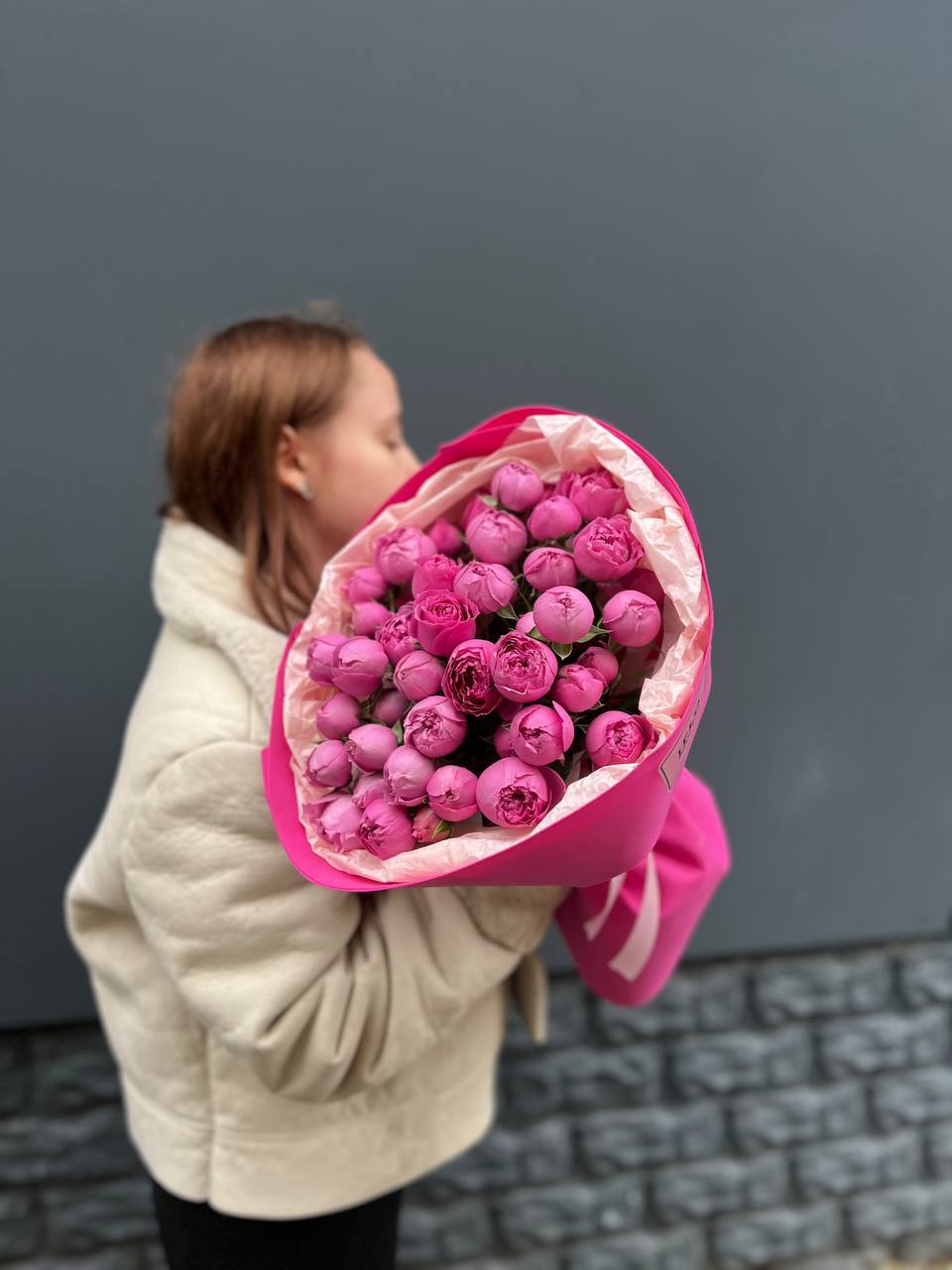 пионовидные розы кустовые мисти баблс в малиновом оформлении.
