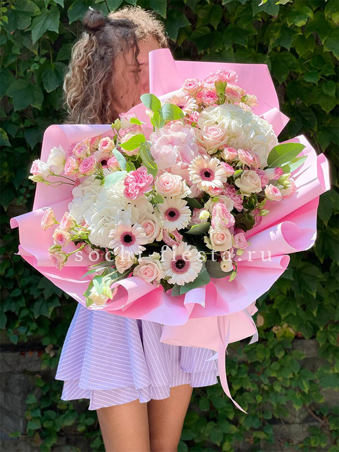 Герберы задают открытый характер букета, розы добавляют мягкости, а гортензия наполняет объёмом. Композиция смотрится свежо и держит форму без усилий.