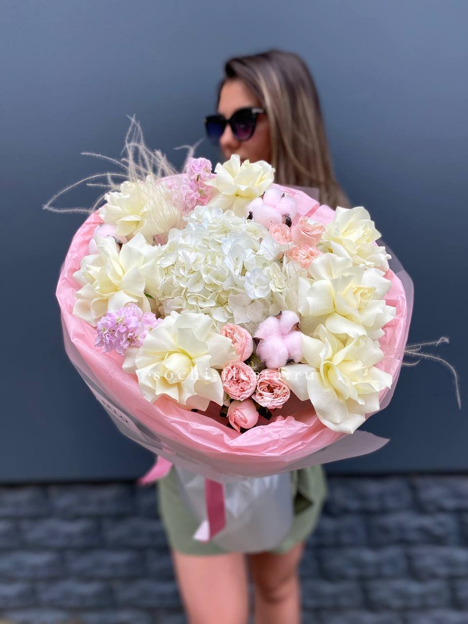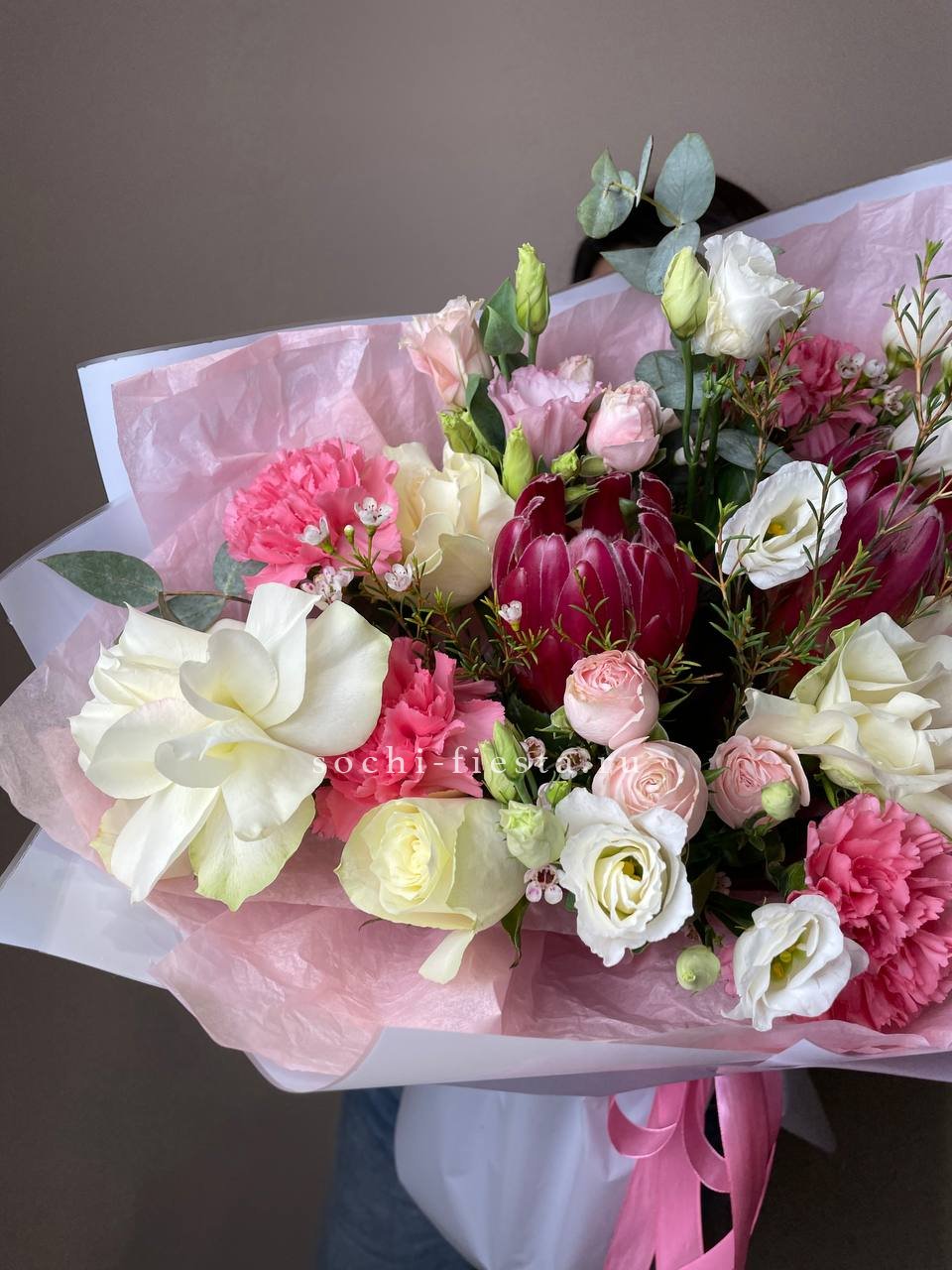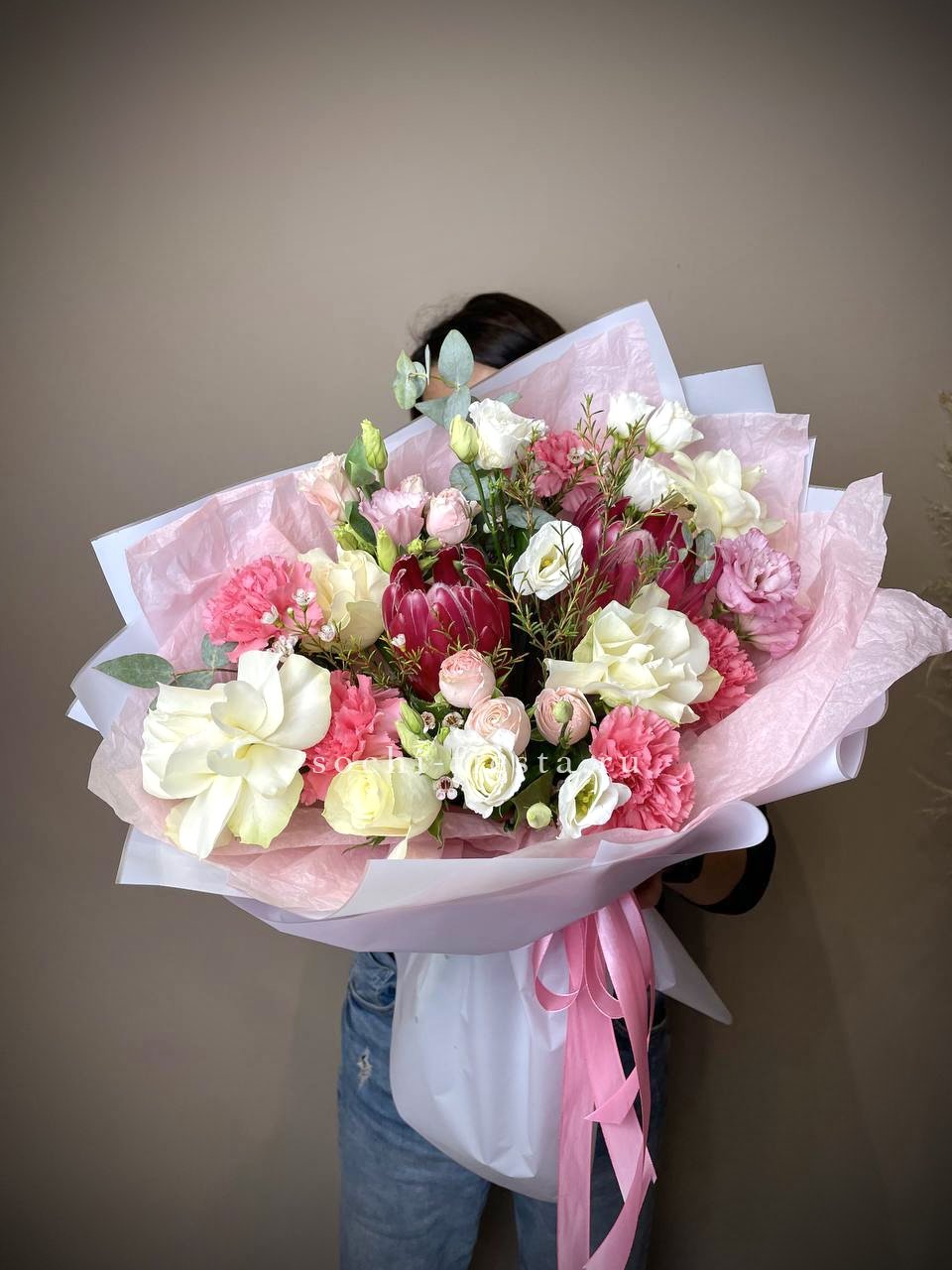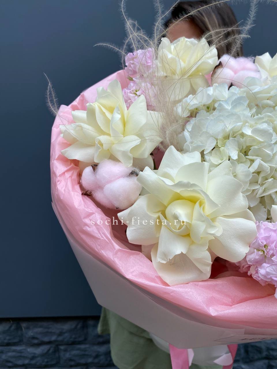 гортензия, розовые розы, диантусы, эустома, маттиолы, эвкалипт лента и дизайнерская пленка.