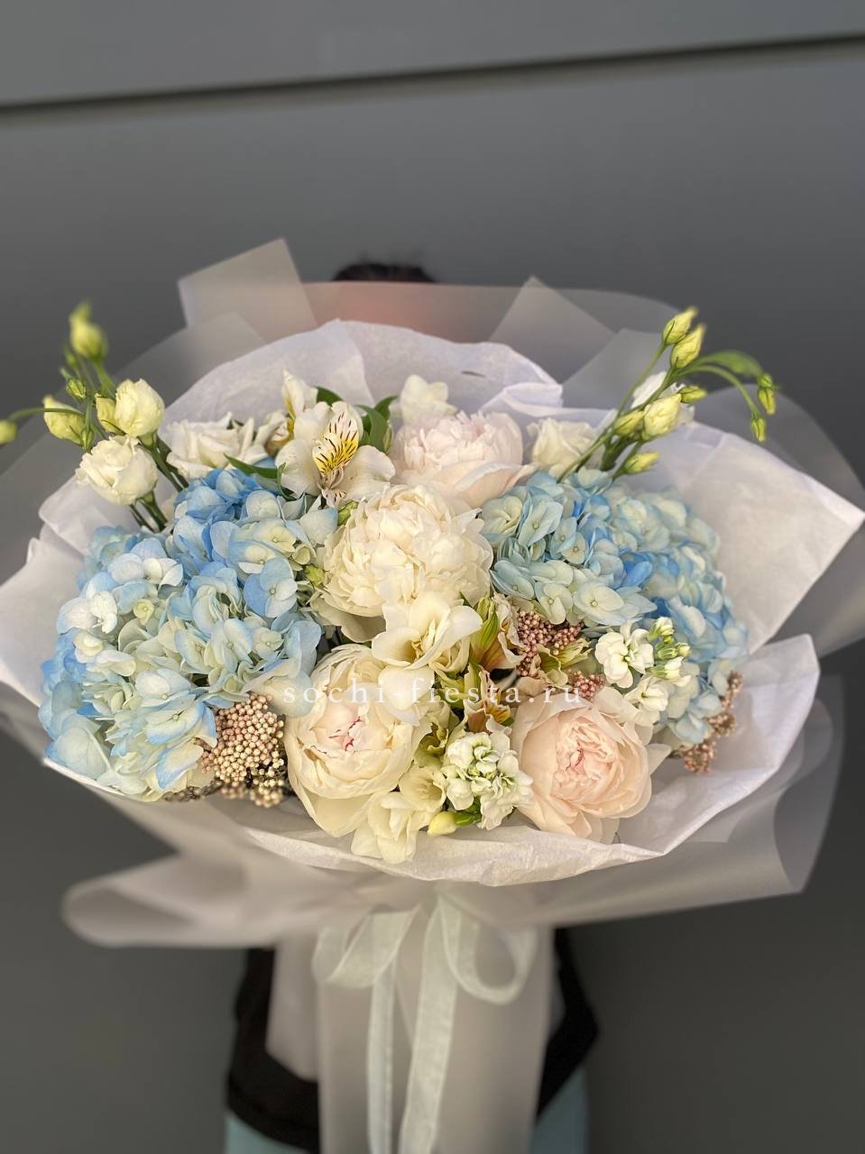 пионы, гортензии, эустома, альстромерии, маттиола, озатамус, лента и дизайнерская пленка.