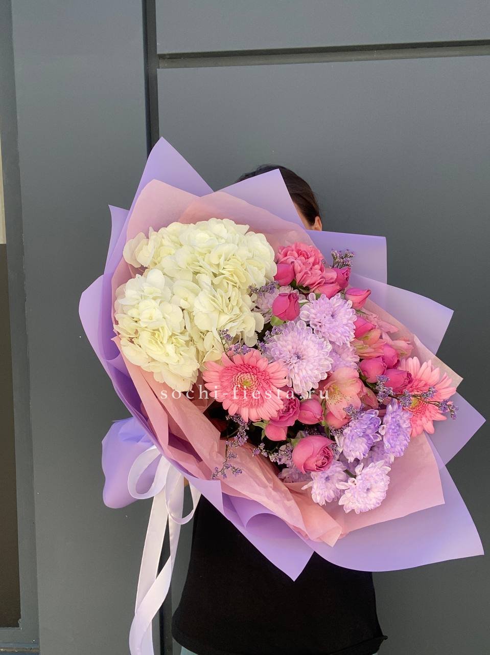 гортензия, кустовые хризантемы, кустовые розы мисти бабблс, герберы, диантусы и лимониум, оформление.