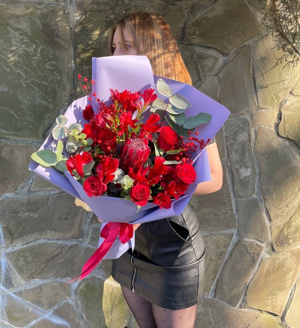 Крупная протея задает ритм всему букету и соседствует с бархатистыми розами и яркой альстромерией. Веточки эвкалипта добавляют легкости и объема этой живописной композиции.