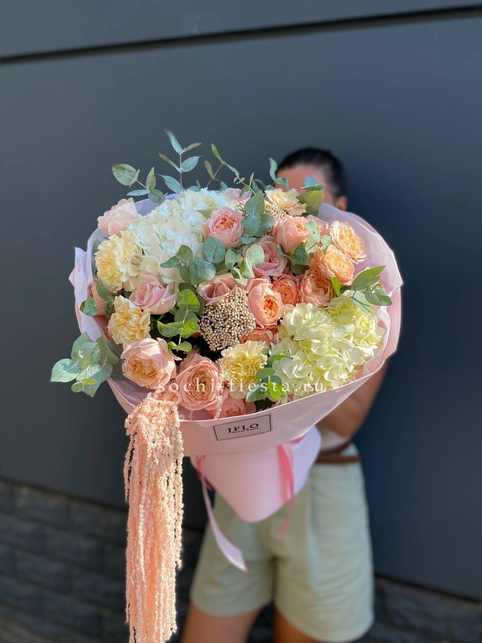 джульетта, озатамус, диантус, гортензия, розовая роза, амарант, оформление.