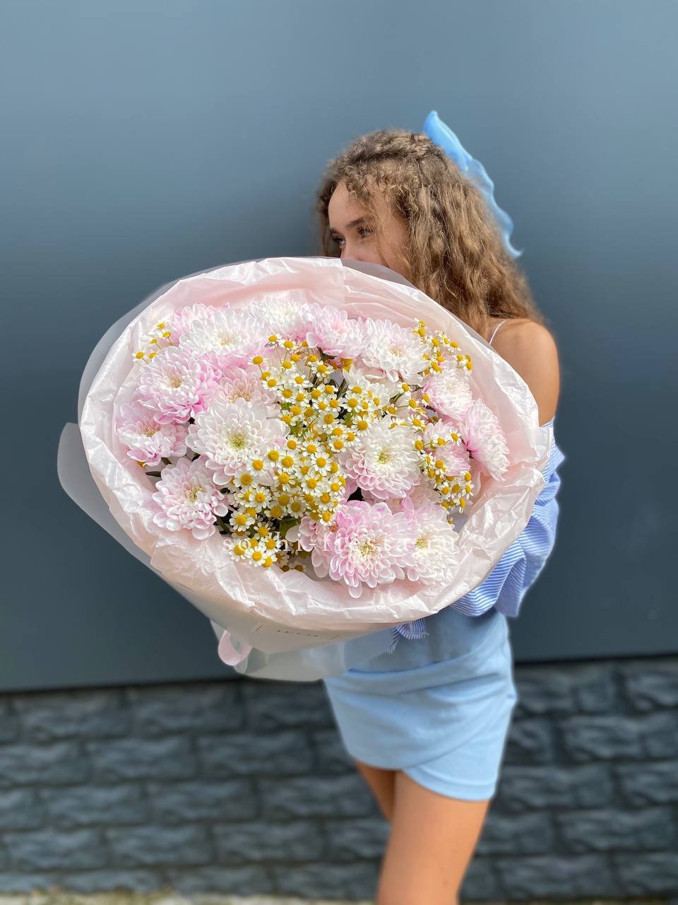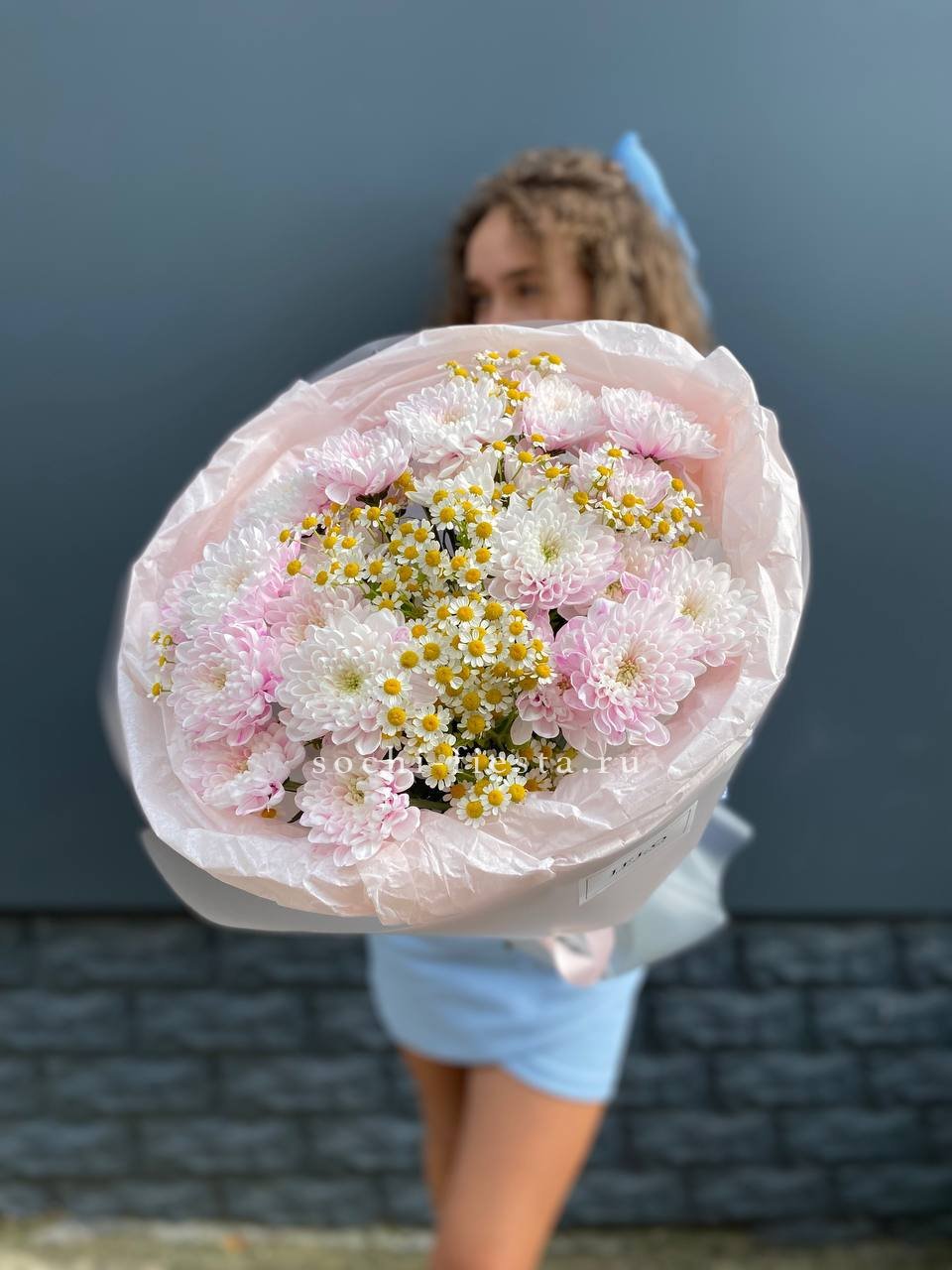 Белоснежные ромашки и кустовые хризантемы собраны в легкую композицию с открытой структурой. Прозрачная упаковка сохраняет воздушность и подчеркивает свежесть каждого бутона.