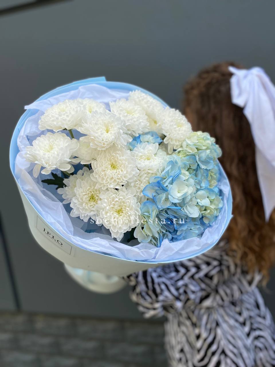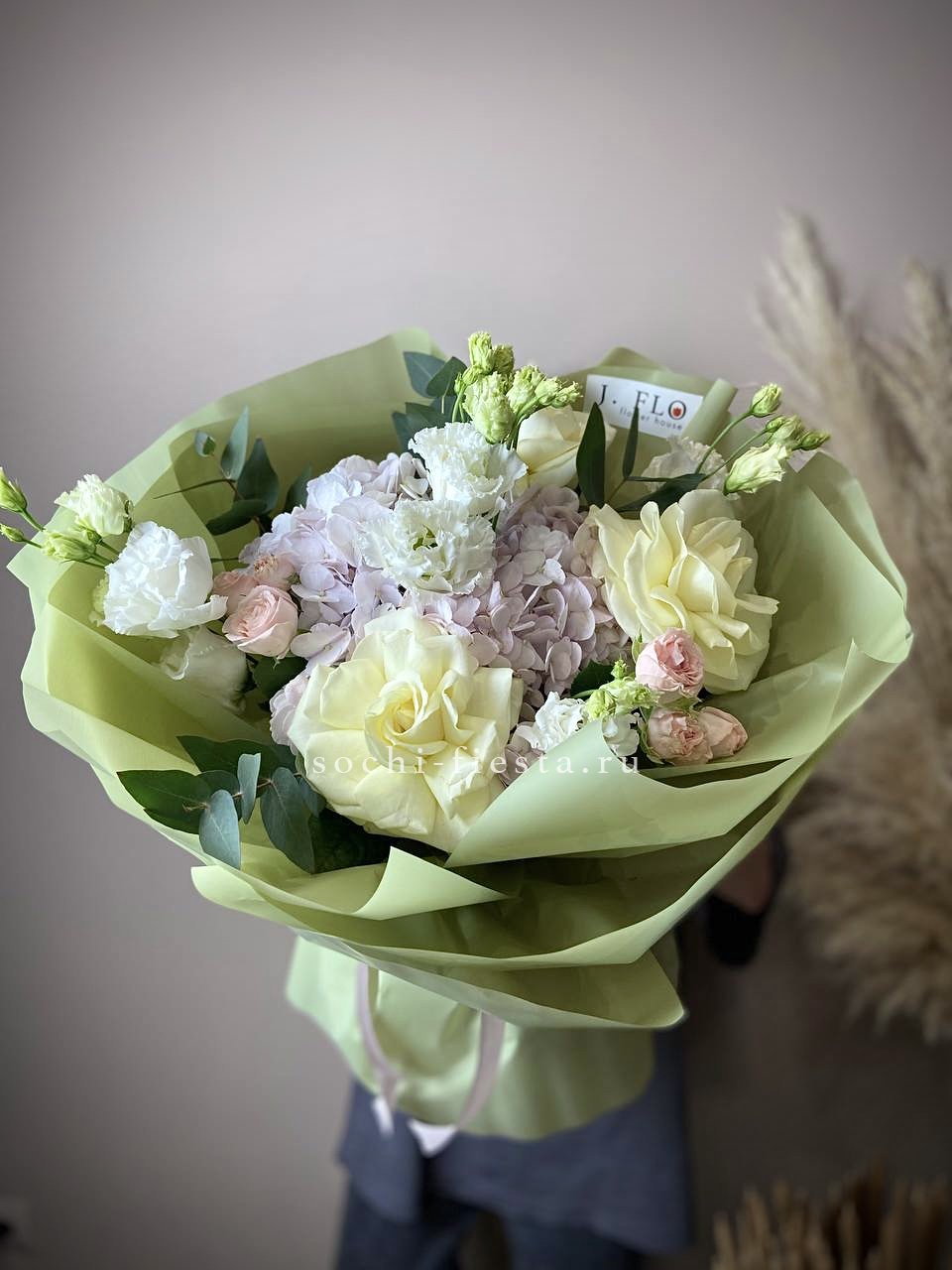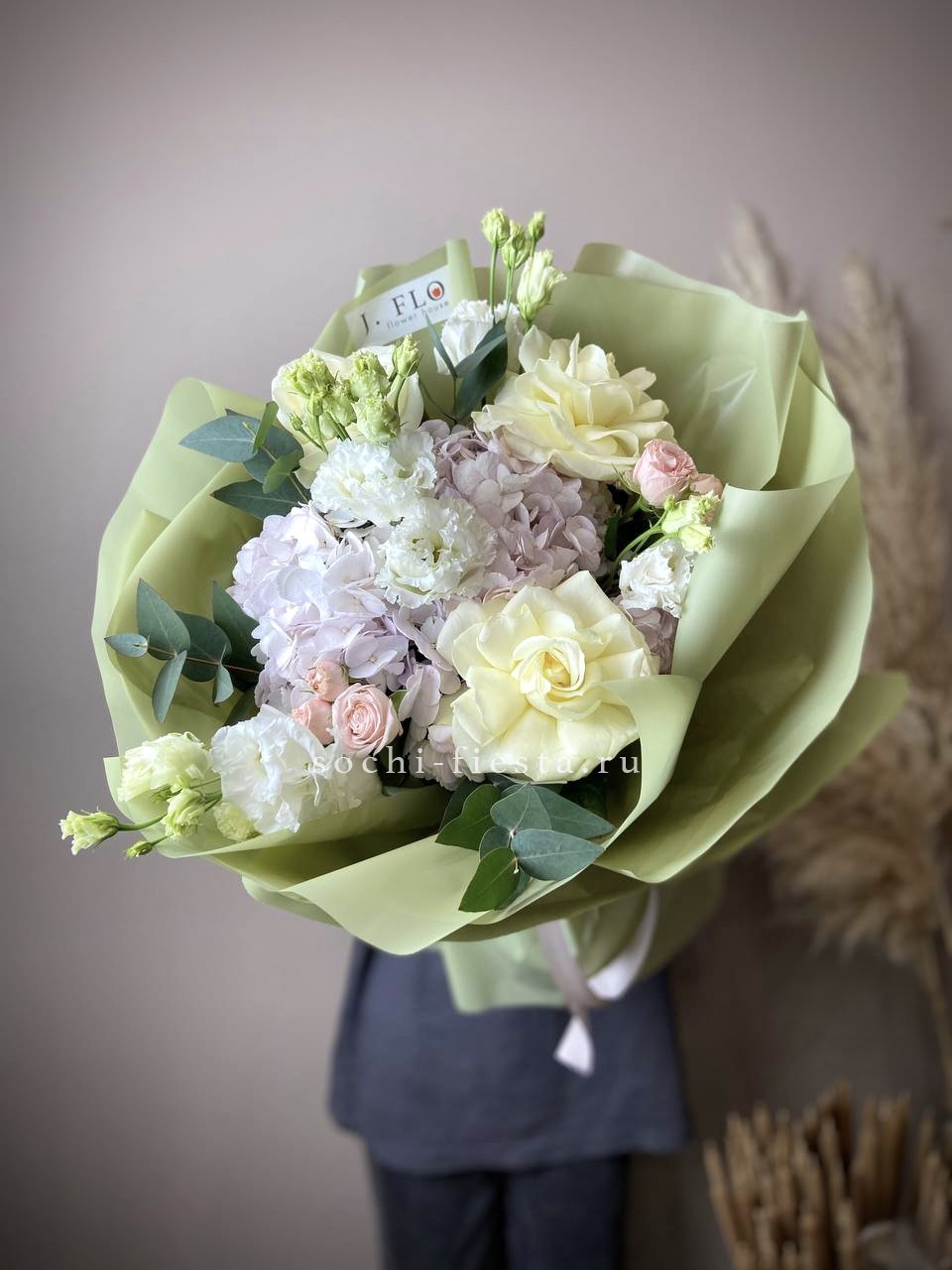 Белые розы и эустома образуют воздушный объем, где каждый бутон дышит свободно. Диантус добавляет графичности, а эвкалипт создает прохладную дымку по краям. Букет для тех, кто ценит легкость и современную флористику.