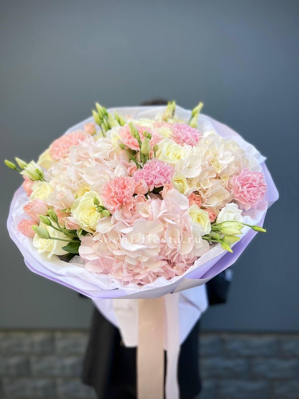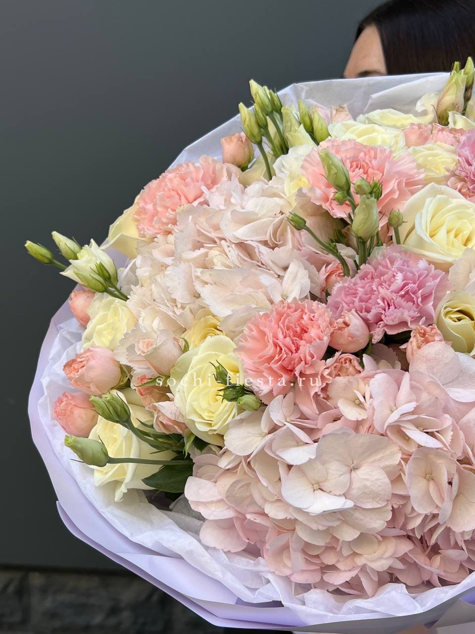 пионы, гортензии, диантусы, маттиола лента и дизайнерская пленка.