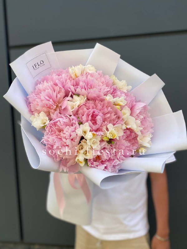 Пышные пионы встречаются с воздушными фрезиями в букете, который радует глаз многослойной структурой. Лепестки раскрываются постепенно, создавая живую композицию с выразительной глубиной.