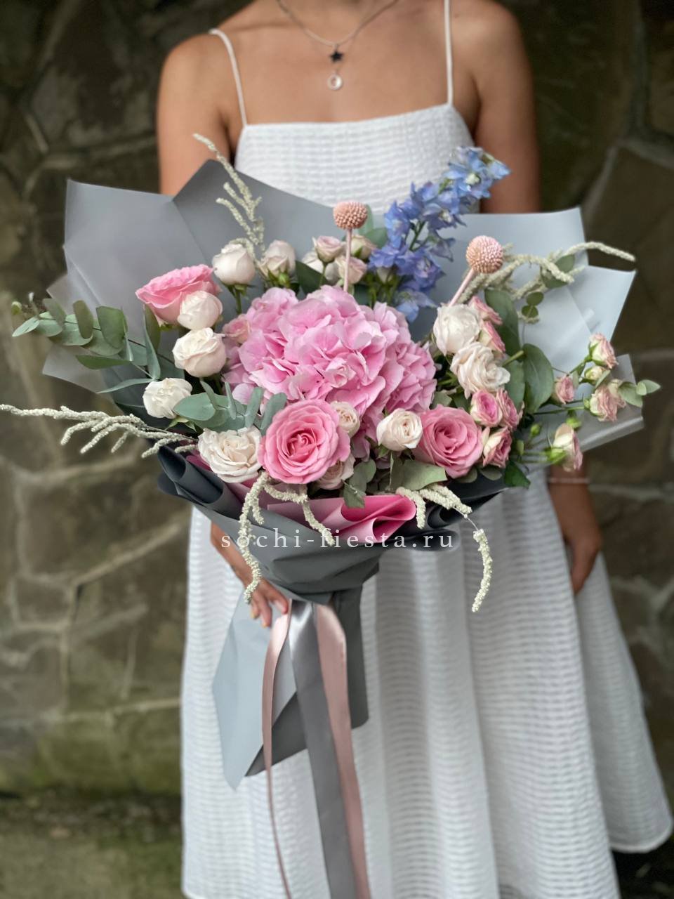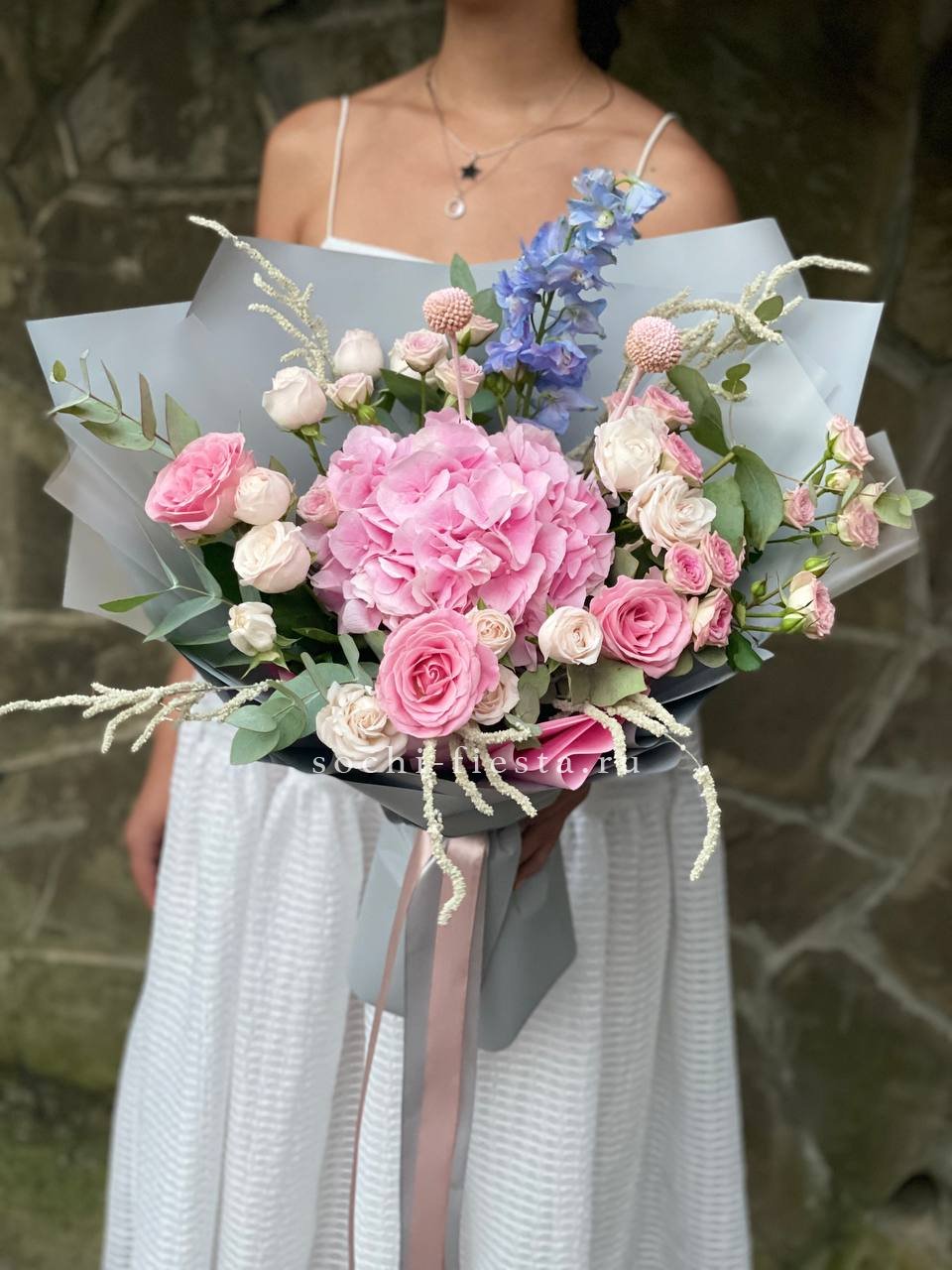 Крупные соцветия гортензии задают основной объем, а эустома и диантус разбивают плотность воздушными бутонами. Мисти баблс и озотамус рассыпаются между цветами, добавляя движение и легкость всей композиции.
