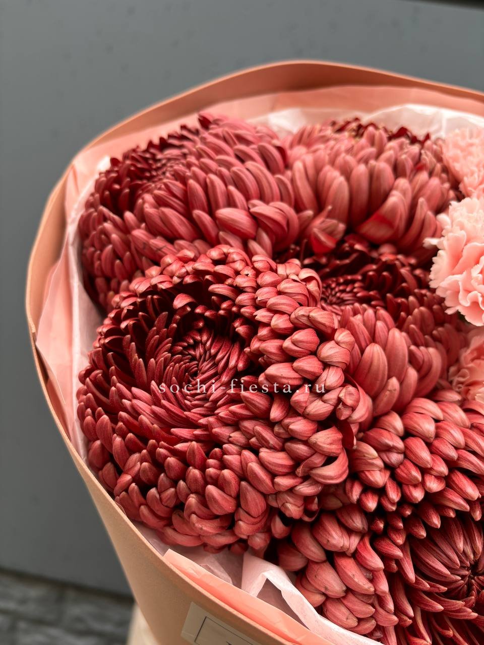 хризантемы Бигуди, диантусы, лента, дизайнерская упаковка.