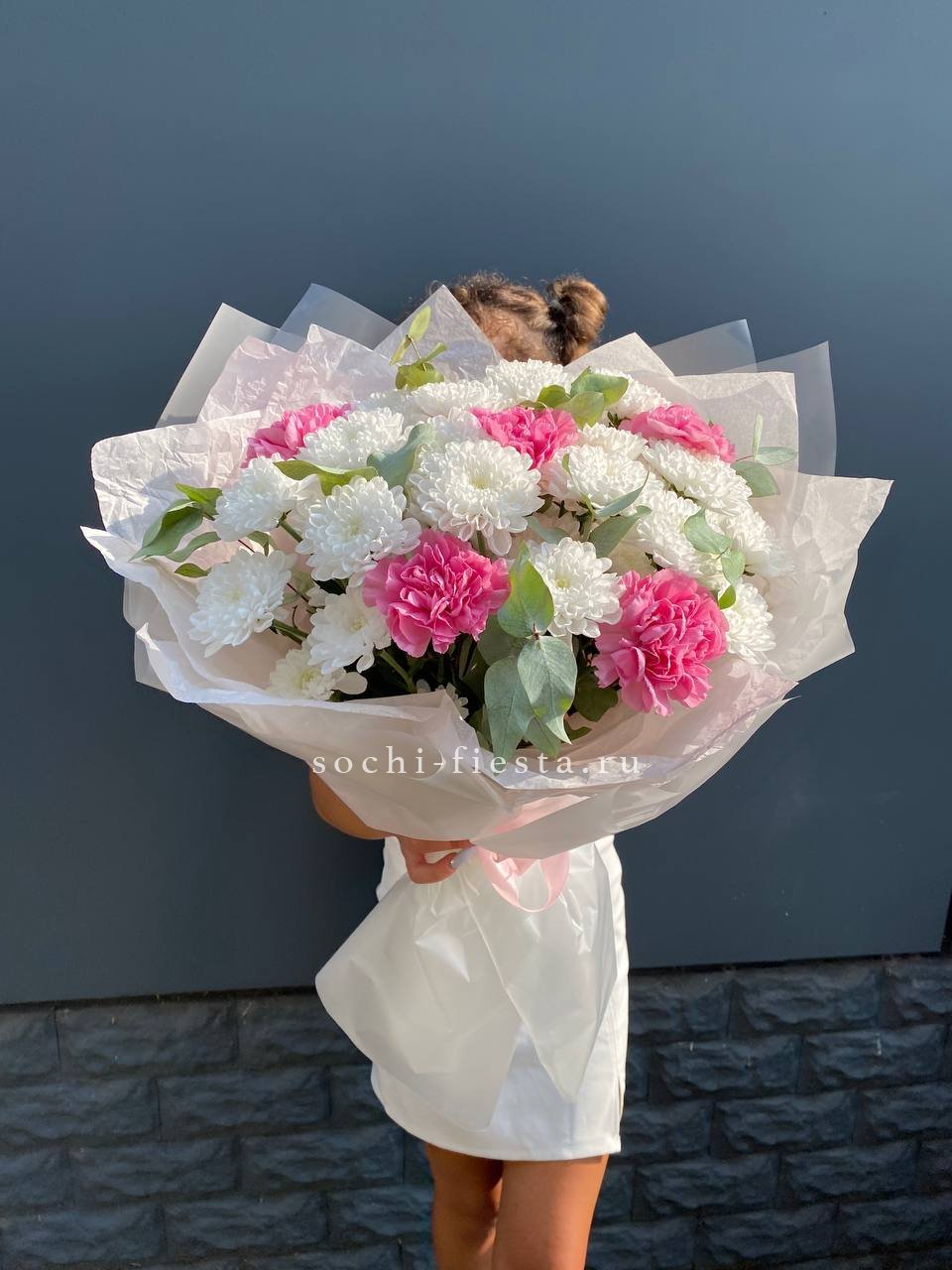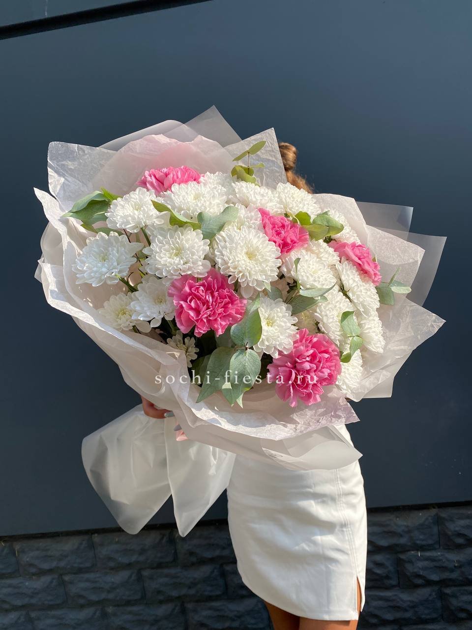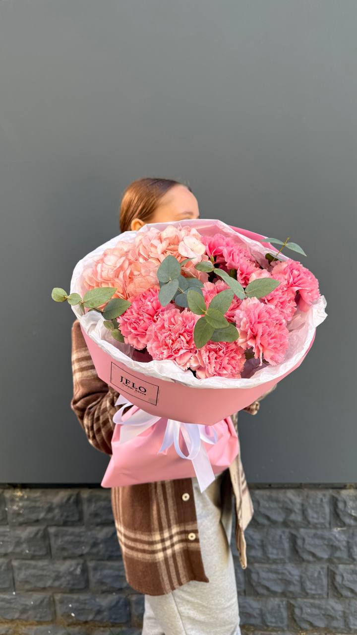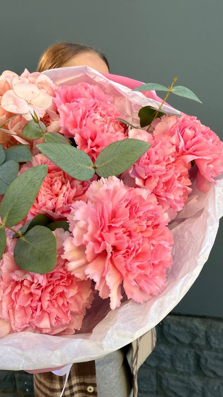 Воздушные соцветия кустовой хризантемы чередуются с яркими головками диантусов. Эвкалипт обрамляет букет серебристой зеленью, создавая лёгкое и свободное настроение.