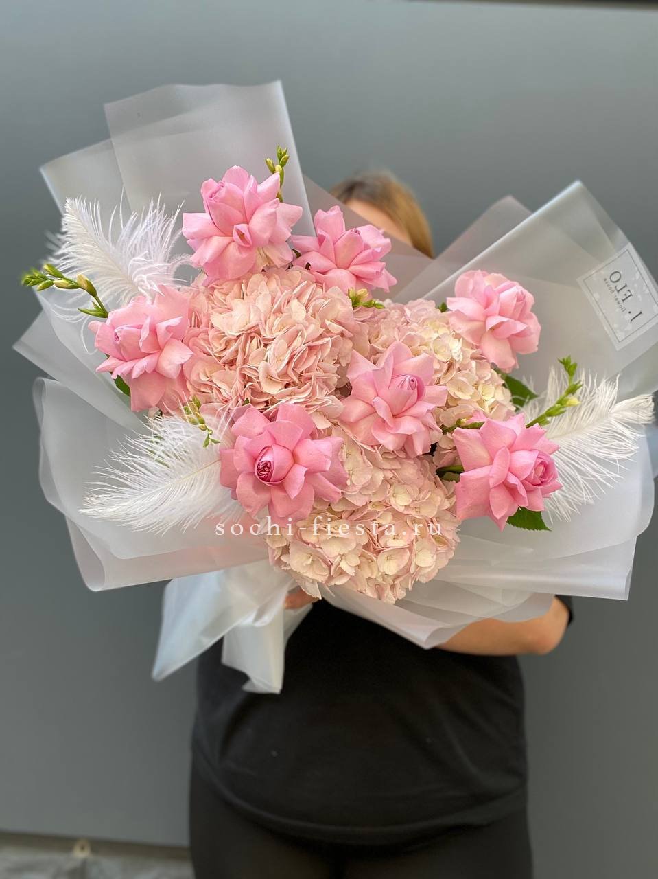 гортензии, розовая роза, перья, упаковка.