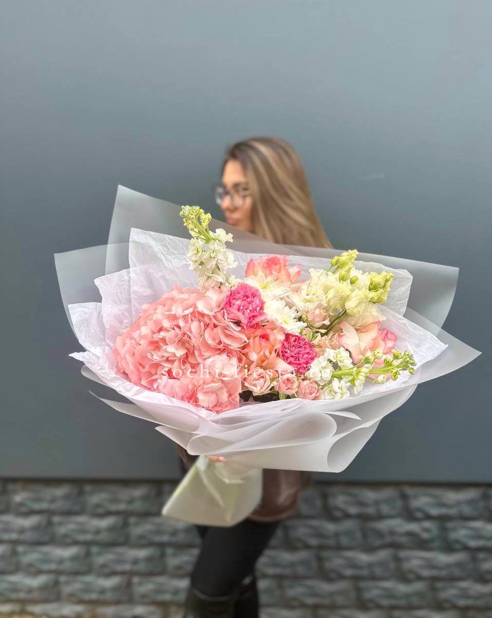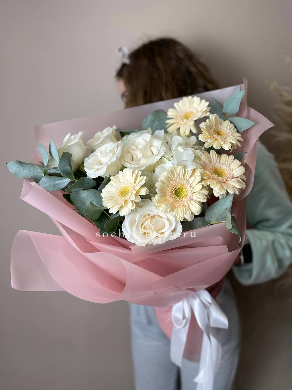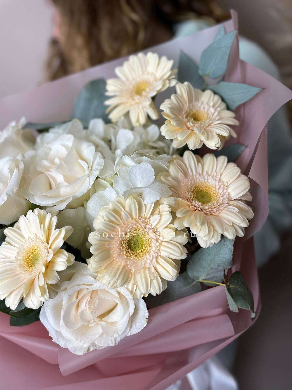 гортензия, хризантема, хамелациум, гербера, мисти баблс, диантус, пленка.