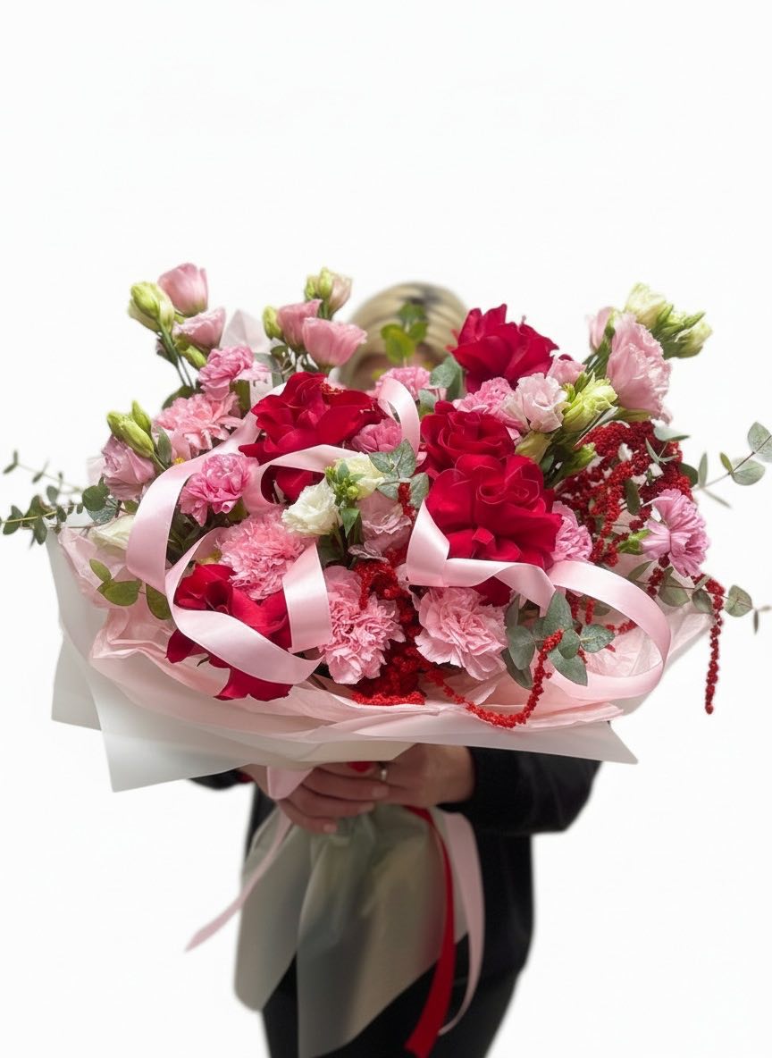 Красные и розовые оттенки переплетаются с цветущими ветками и пушистым лагурусом. Аспарагус добавляет воздушности, а кустовые розы заполняют пространство живой энергией. Букет держит форму и притягивает взгляд.