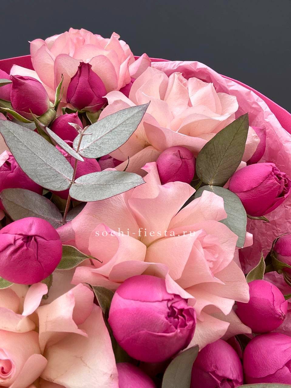 Пышный микс из гербер, хризантем и роз в обрамлении диантуса и статицы. Букет собран плотно, с яркими акцентами по всей форме. Озатамус и эвкалипт добавляют глубину и завершенность композиции.
