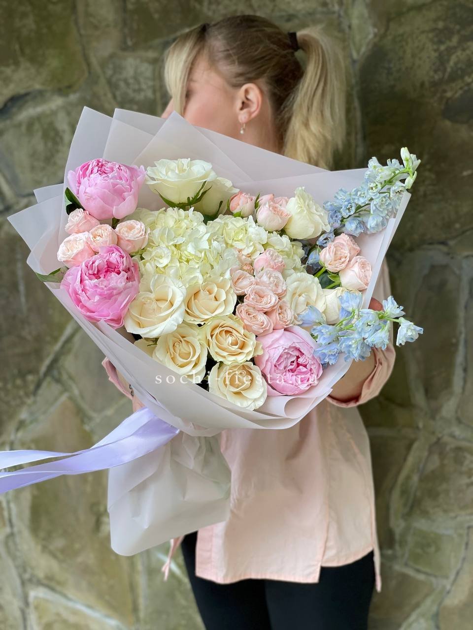 гортензия, пионы, кустовые пионовидные розы, одноголовые розы, дельфиниум (или аналог вне сезона), лента, дизайнерская упаковка.