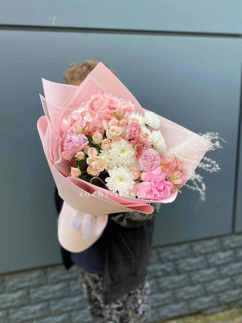 Пышные пионы и воздушные гортензии образуют объёмную композицию с живописной структурой. Кустовые розы и альстромерии добавляют букету плотности и заполняют пространство между крупными соцветиями.