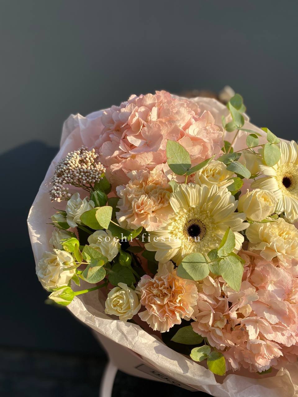 гербера, диантус, гортензия, бомбамстик, озатамус в нежном оформлении.