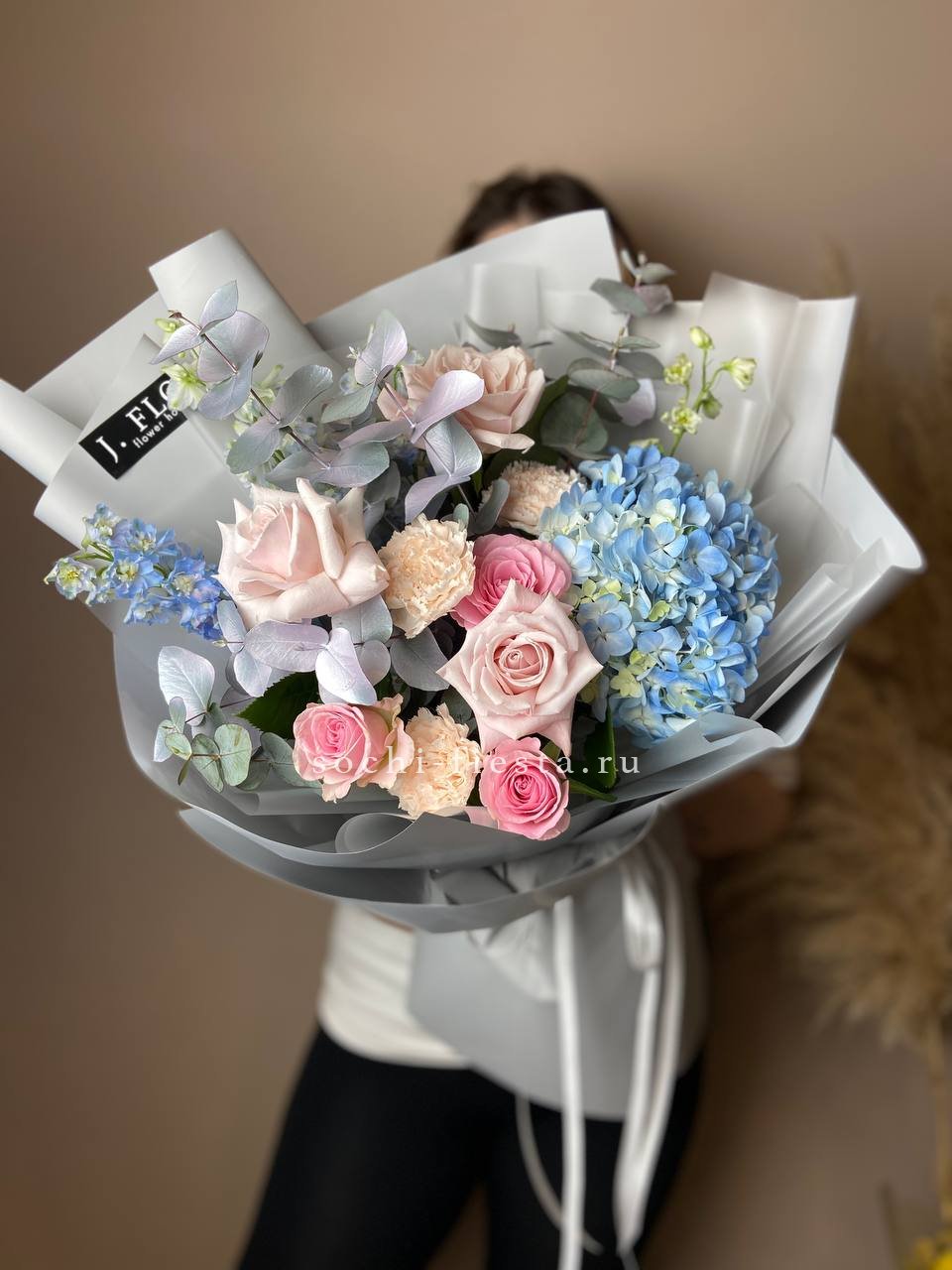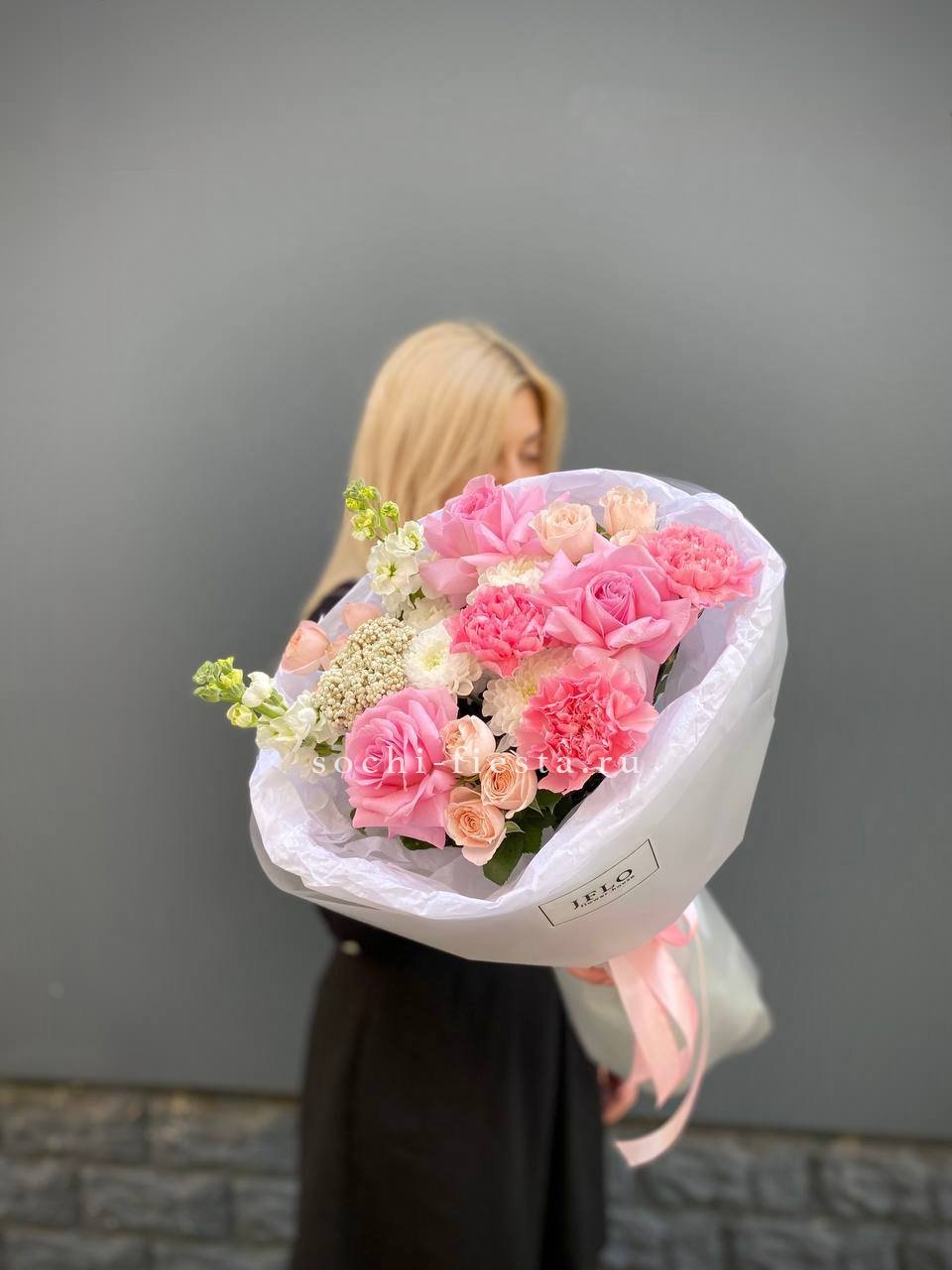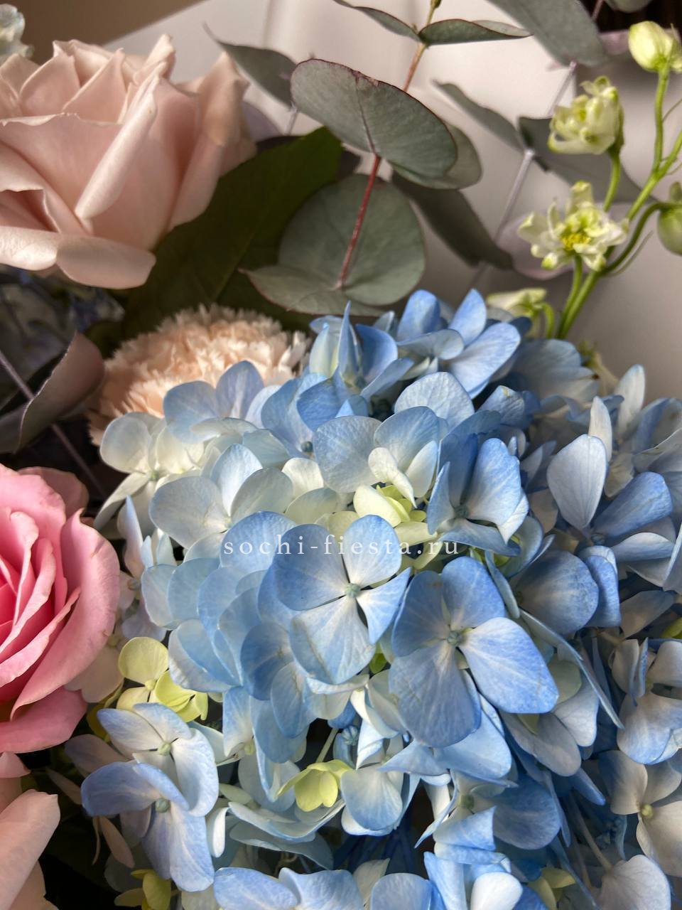 розы, гортензия, альстромерии, маттиола лента и дизайнерская пленка.