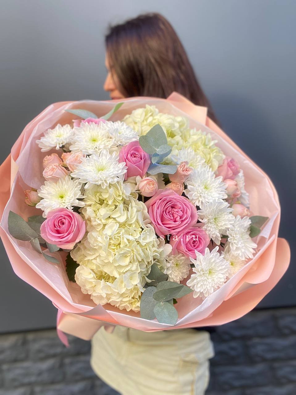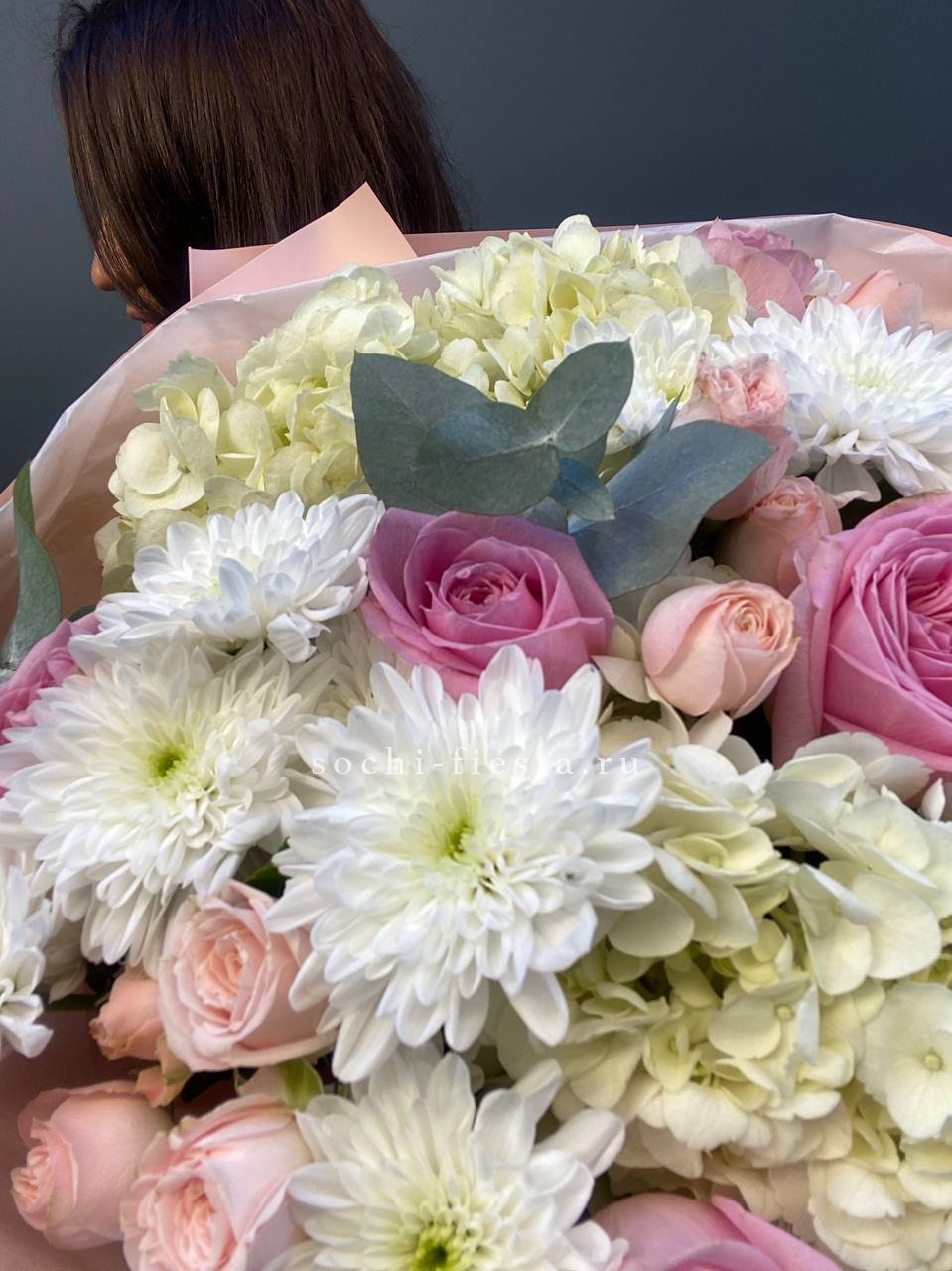 гортензия, пионовидная кустовая роза,  розовая роза, хризантема,  эвкалипт, лента, дизайнерская пленка.