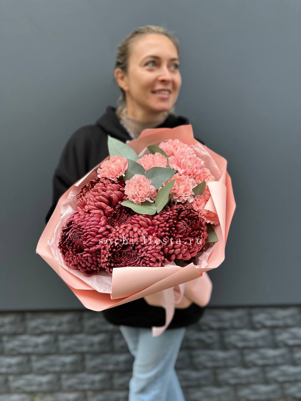 Диантусы и бигуди собраны в плотную форму с чёткими линиями. Эвкалипт задаёт вертикальный ритм и добавляет свежести. Композиция выглядит графично и современно.