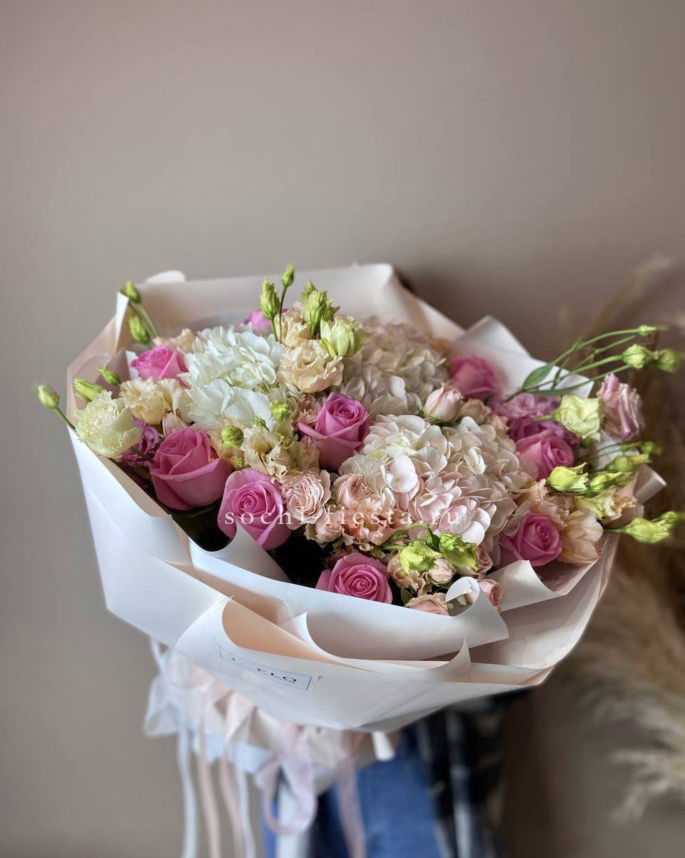 гортензия, пионовидные розы, пампасная трава (стифа), лента, дизайнерская упаковка.