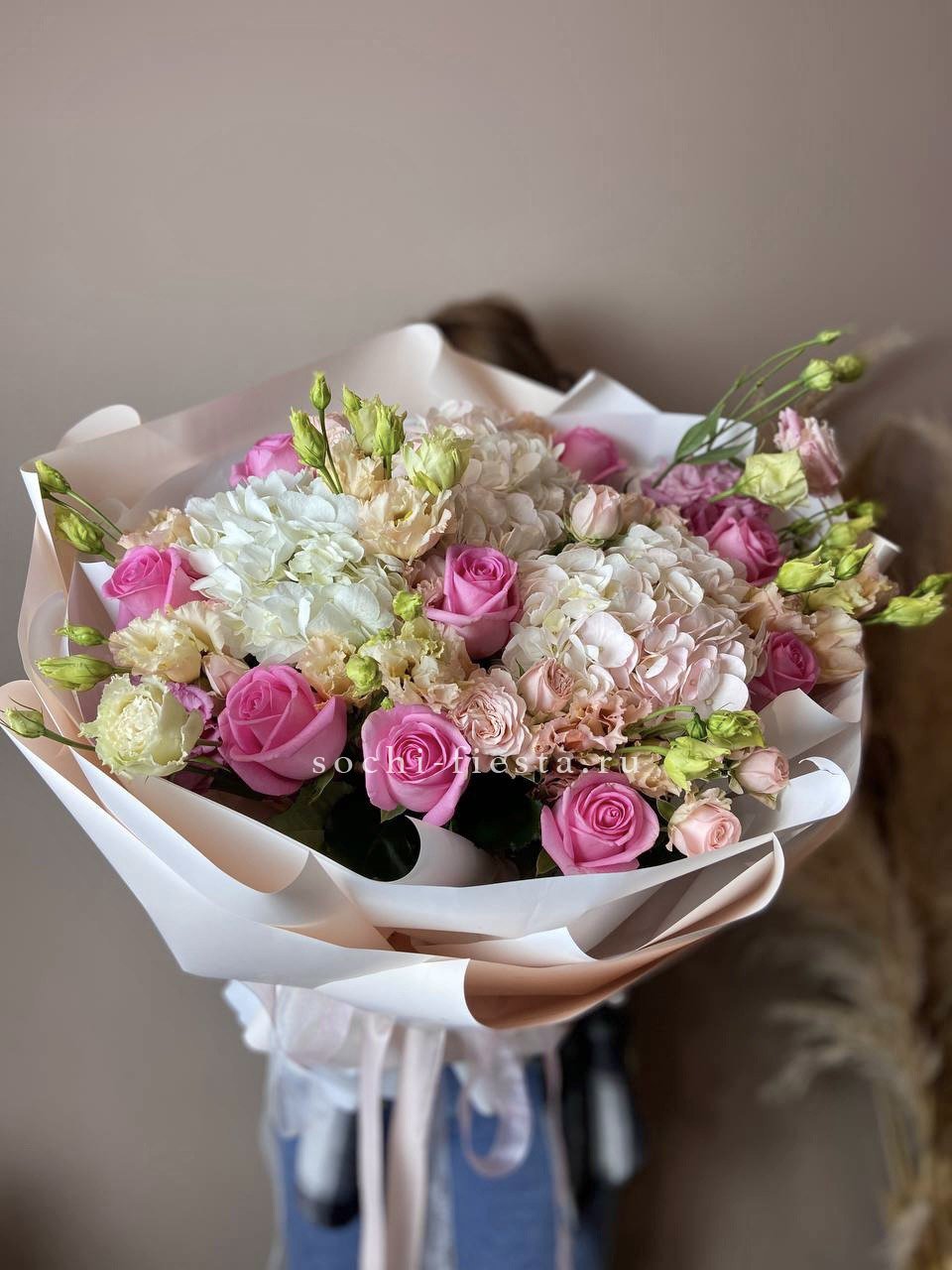 Пышные шапки гортензии и густые бутоны пионовидных роз в розовой гамме. Пампасная трава привносит текстурный акцент и делает композицию объёмной.